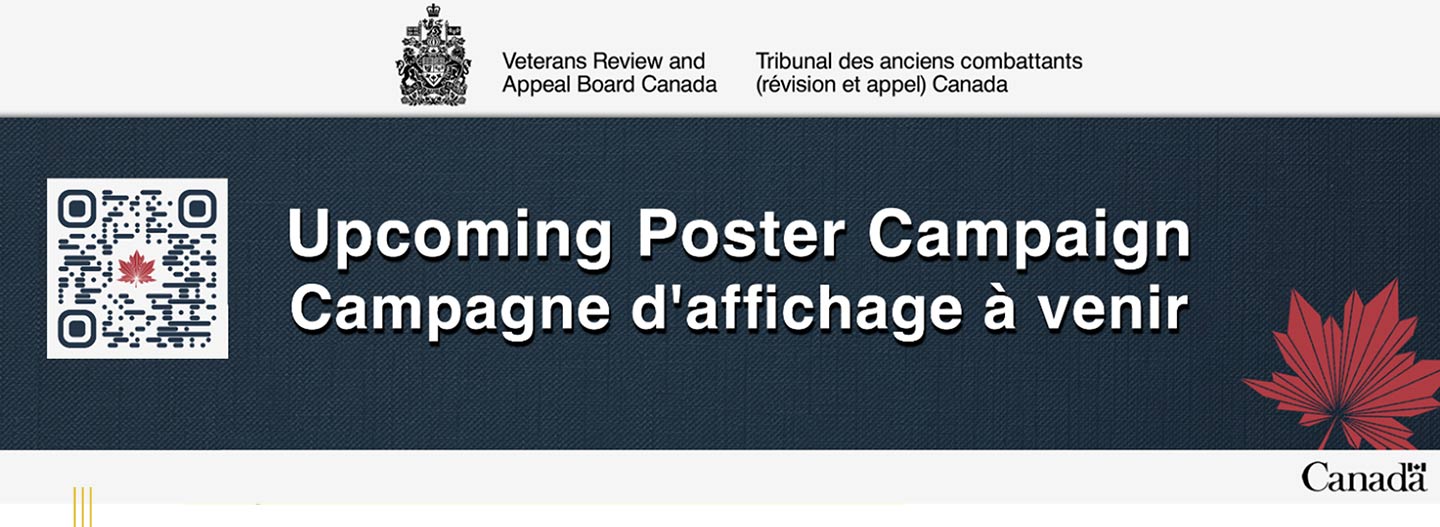 | Upcoming Poster Campaign | | The Veterans Review and Appeal Board (VRAB) will be launching a poster campaign across all Legion Branches nationwide. This initiative aims to raise awareness amongst Veterans about their right to appeal disability benefits decisions made by Veterans Affairs Canada. | | Posters will be mailed out in the coming weeks and we ask for your help in displaying them in your Branch. If you have any questions, please contact comms@vrab-tacra.gc.ca. We appreciate your support. |