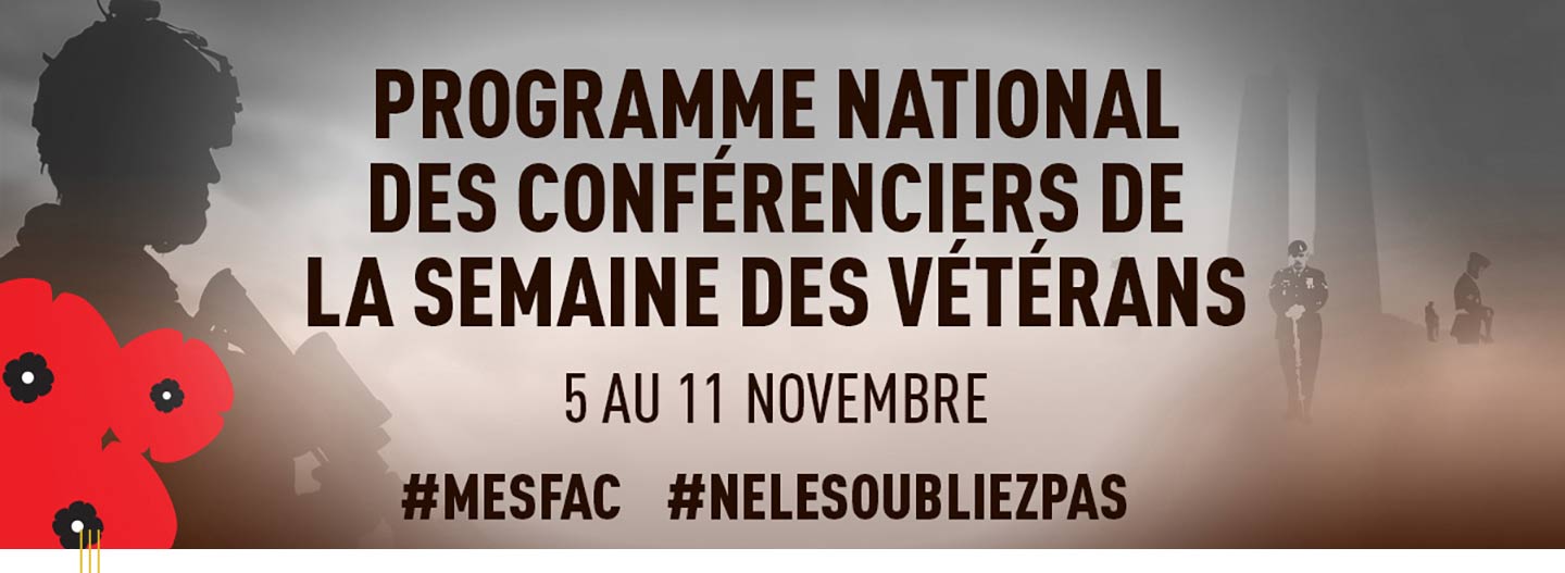 Vous souhaitez accueillir des membres des FAC à l’occasion de la Semaine des vétérans ? | Saviez-vous que le ministère de la Défense nationale offre aux Canadiens l’occasion de faire revivre l’histoire et d’entendre les récits de nos vétérans dans le cadre du Programme des conférenciers national de la Semaine des vétérans ? Vous pouvez inviter un conférencier des FAC à faire une présentation en personne ou par vidéo pendant la Semaine des vétérans, du 5 au 11 novembre. | Le nombre de demandes que le PNCSV peut satisfaire est limité, et la période d’inscription pour les présentations en personne prendra fin le 20 octobre 2025. | En apprendre davantage ‣