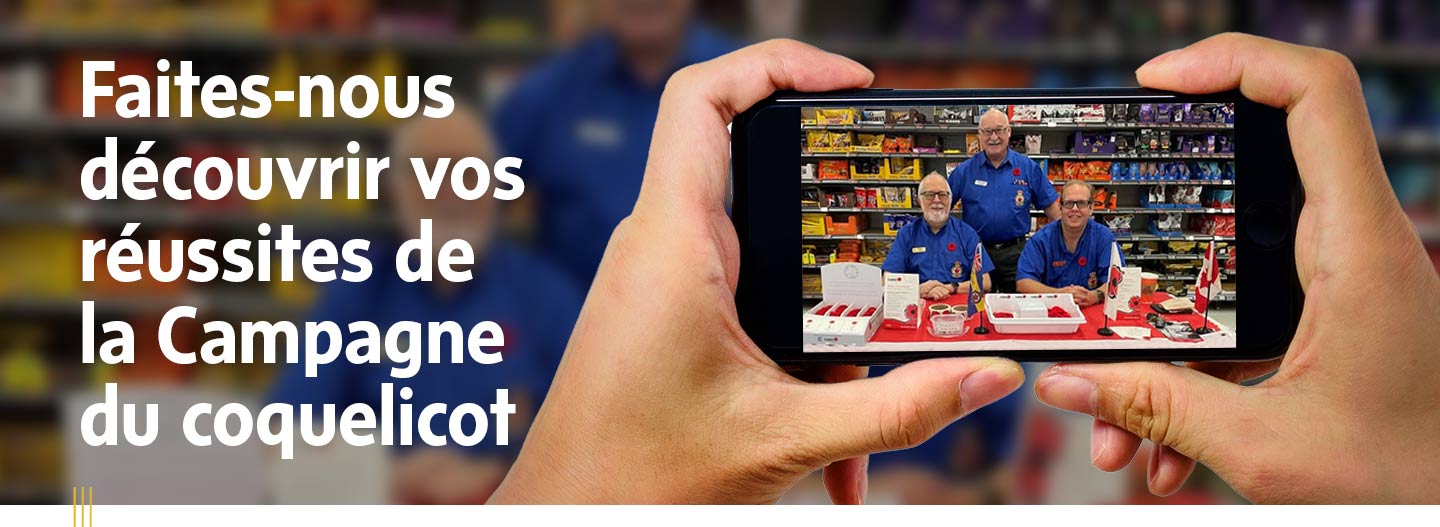 | Faites-nous découvrir vos réussites de la Campagne du coquelicot | | Alors que le jour du Souvenir approche à grands pas, nous souhaitons voir comment votre filiale se mobilise dans la collectivité pendant la Campagne du coquelicot. Qu’il s’agisse d’une table de dons originale, de partenariats locaux ou d’une installation unique qui attire l’attention, nous voulons le voir ! | | Prenez une photo de vos présentoirs de dons de coquelicots et identifiez-nous sur Facebook, ou envoyez-la par courriel à marketing@legion.ca. Mettons en valeur les formidables initiatives des filiales d’un océan à l’autre qui soutiennent le Souvenir et rendent hommage aux vétérans du Canada. |