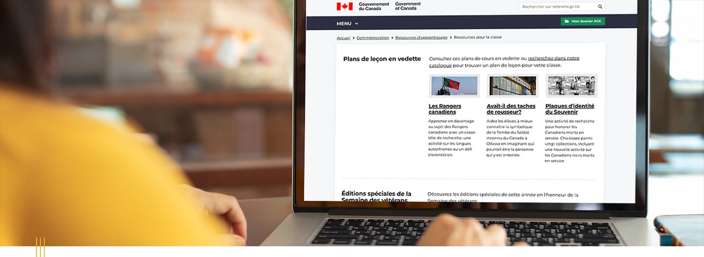 | Ressources pour la classe – Anciens Combattants Canada | | Le jour du Souvenir approche à grands pas! Vous cherchez du matériel bilingue gratuit pour aider les jeunes de votre communauté à en apprendre davantage sur les vétérans? Consultez les nombreuses ressources numériques d’Anciens Combattants Canada, notamment des vidéos, des plans de cours, des entrevues avec des vétérans et des renseignements historiques. Les populaires produits imprimés de la Semaine des vétérans sont également de retour pour 2025. Commandez dès aujourd’hui... jusqu’à épuisement des stocks. Consultez aussi le dépliant de la Semaine des vétérans d’ACC pour y découvrir d’autres ressources. |