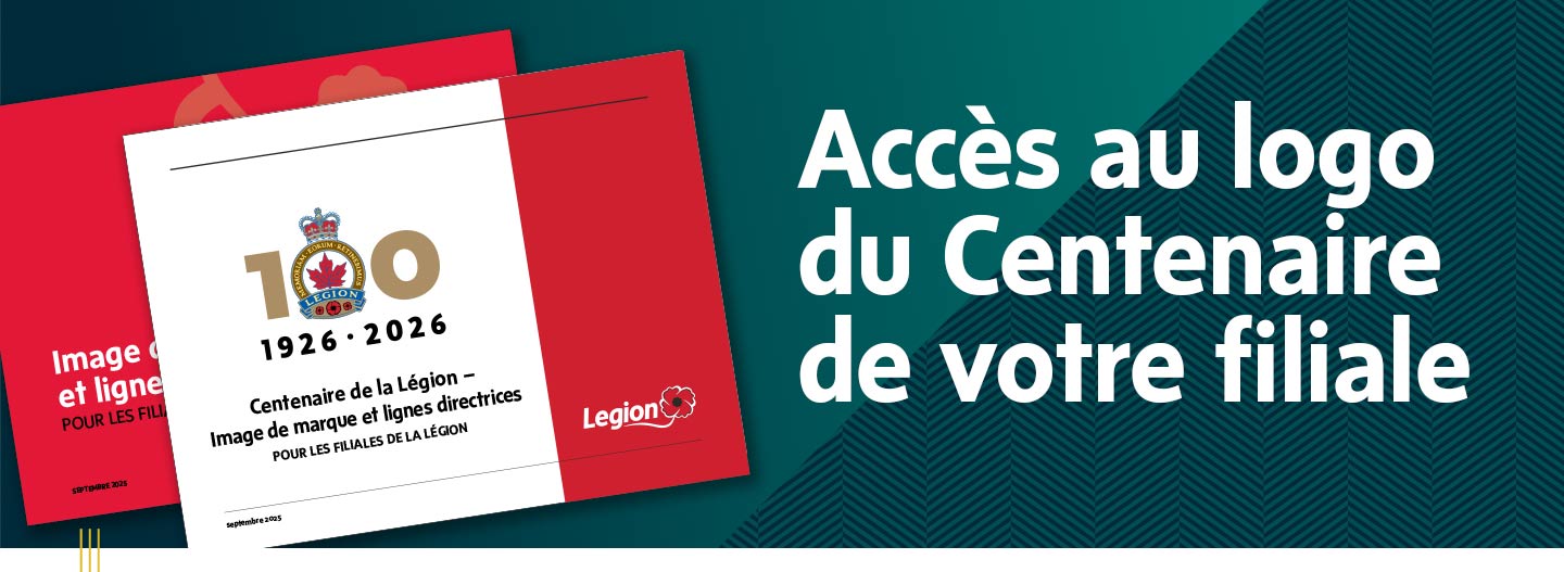 | Rappel : Accès au logo du Centenaire de votre filiale | | Pour les filiales : SVP consulter votre courriel intitulé « Logos du centenaire de la Légion pour votre filiale » pour obtenir les instructions sur la manière d’accéder aux fichiers du logo personnalisé de votre filiale. Chaque filiale a reçu : | - Logo du Centenaire – comprenant le logo du 100e anniversaire de la Légion, le numéro de filiale et le nom de la ville (AI, JPG, PNG). Note : Ne pas utiliser avant le 17 novembre 2025.
